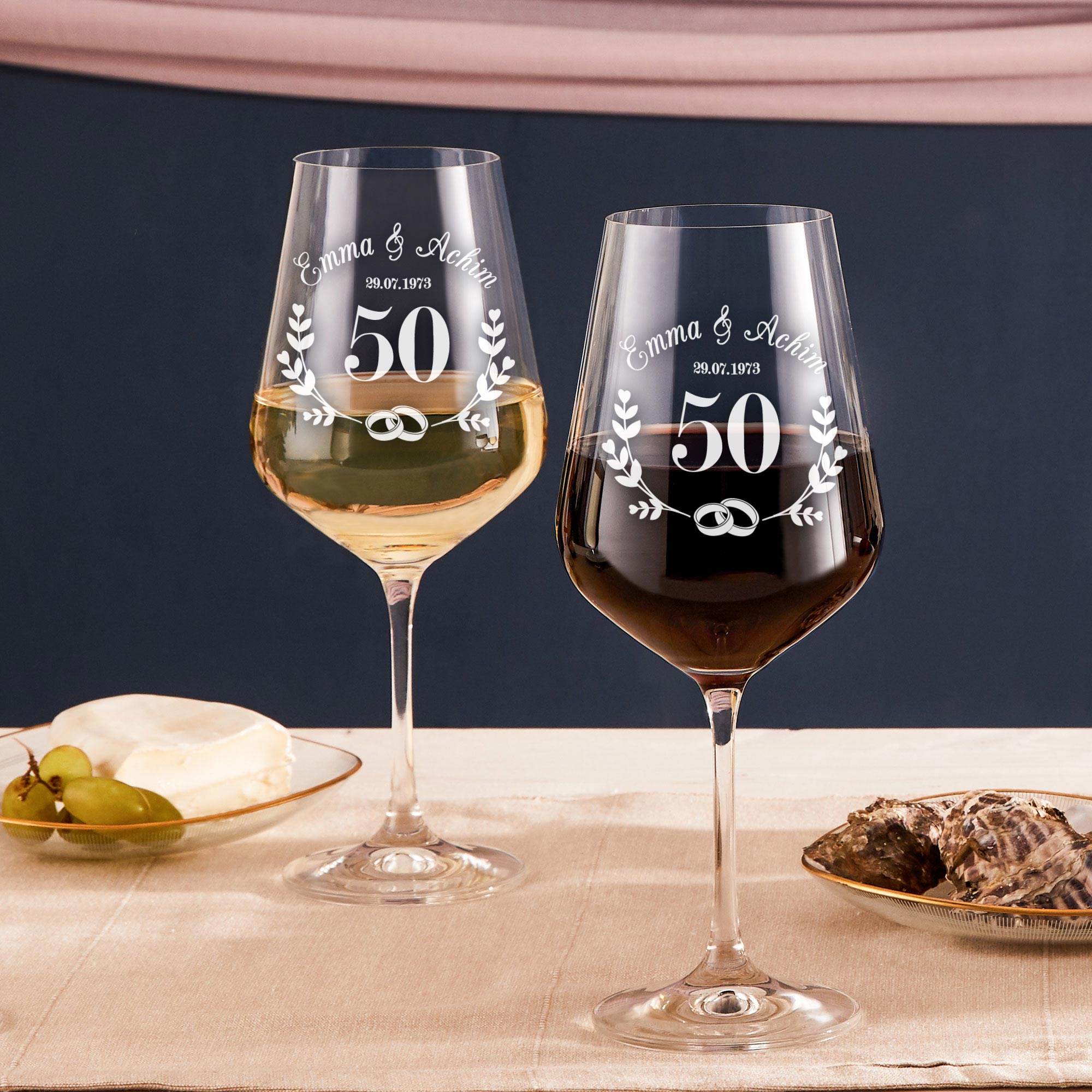 Auf den Gläsern wird die große Zahl "50" unübersehbar verewigt, um ein einzigartiges Andenken an die Goldhochzeit zu erschaffen. Zudem werden zwei individuelle Namen und ein Wunschdatum verewigt, um den Weingläsern eine persönliche Note zu verleihen. Die Gläser eignen sich für den Genuss von Rotwein, als auch Weißwein und bereichern jeden Haushalt um ein dekoratives Wein-Accessoire.