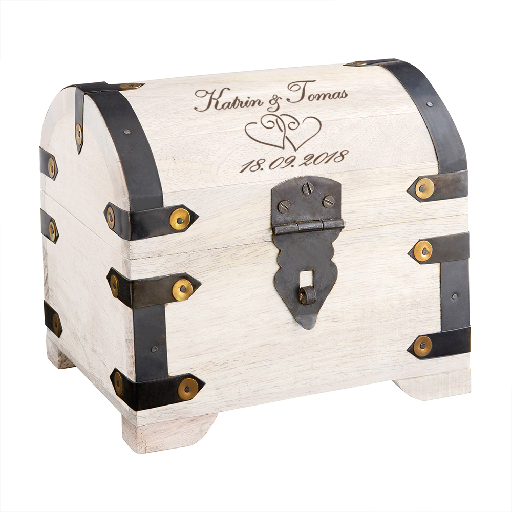 Diese helle Aufbewahrungsbox für Geld, Schmuck oder andere kleine Gegenstände ähnelt von ihrem Aussehen her einer rustikalen Schatzkiste, wie man sie aus Piratenfilmen kennt. Sie besteht aus echtem Holz und besitzt zudem schwarze Metallbeschläge im antiken Look. Das Besondere an dieser urigen Truhe: Unsere professionellen Graveure versehen sie vor der Auslieferung liebevoll mit einer ganz persönlichen, individuell auf das Brautpaar zugeschnittenen Gravur nach Deinen Angaben! Dabei hast Du die Wahl zwischen zwei sich leicht überlappenden Herzen oder Ringen. Dazu kommen noch die Namen der Braut und des Bräutigams, sowie dem Datum, an dem die Hochzeit stattfindet.