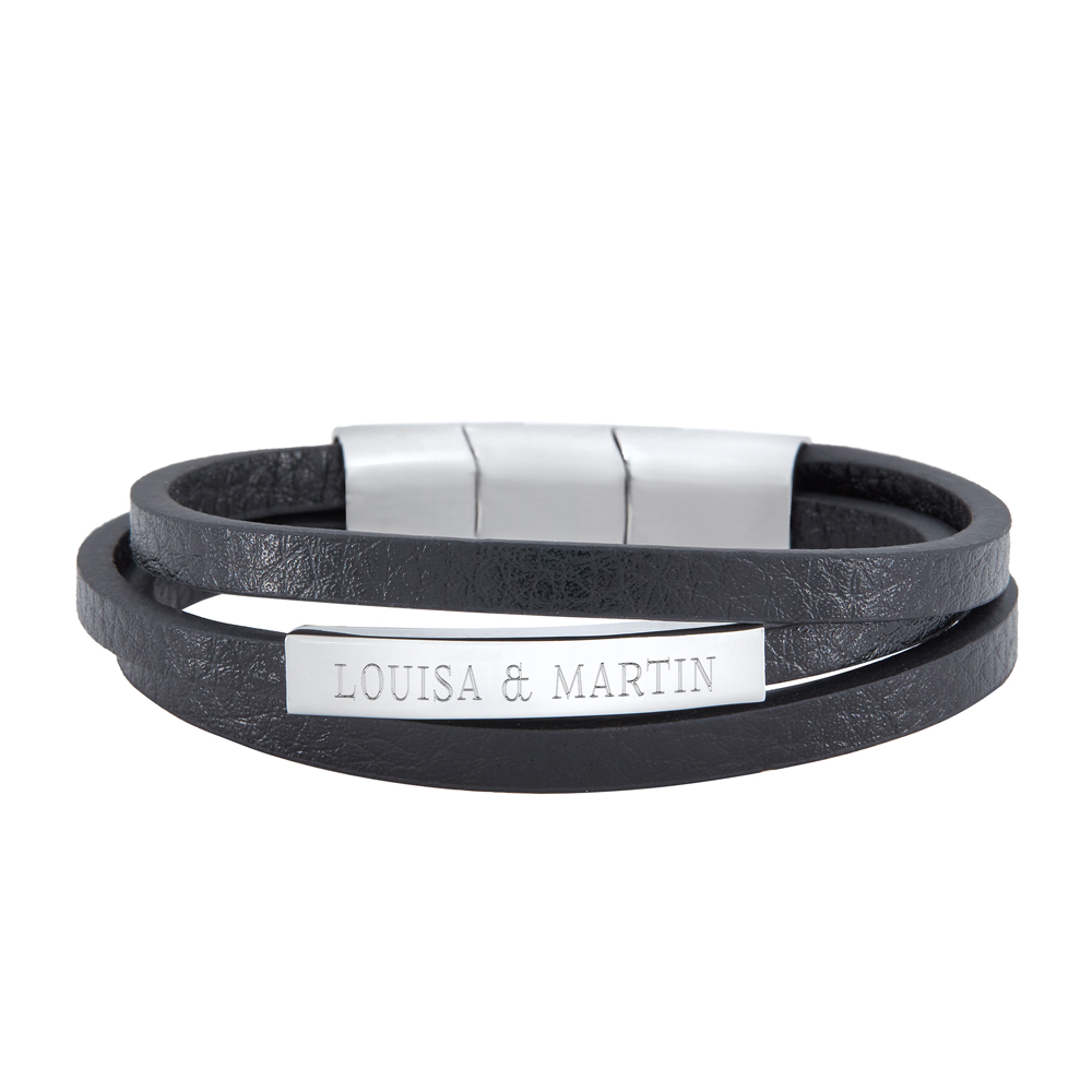 Schwarzes Männerarmband aus Leder mit 2 gravierten Namen