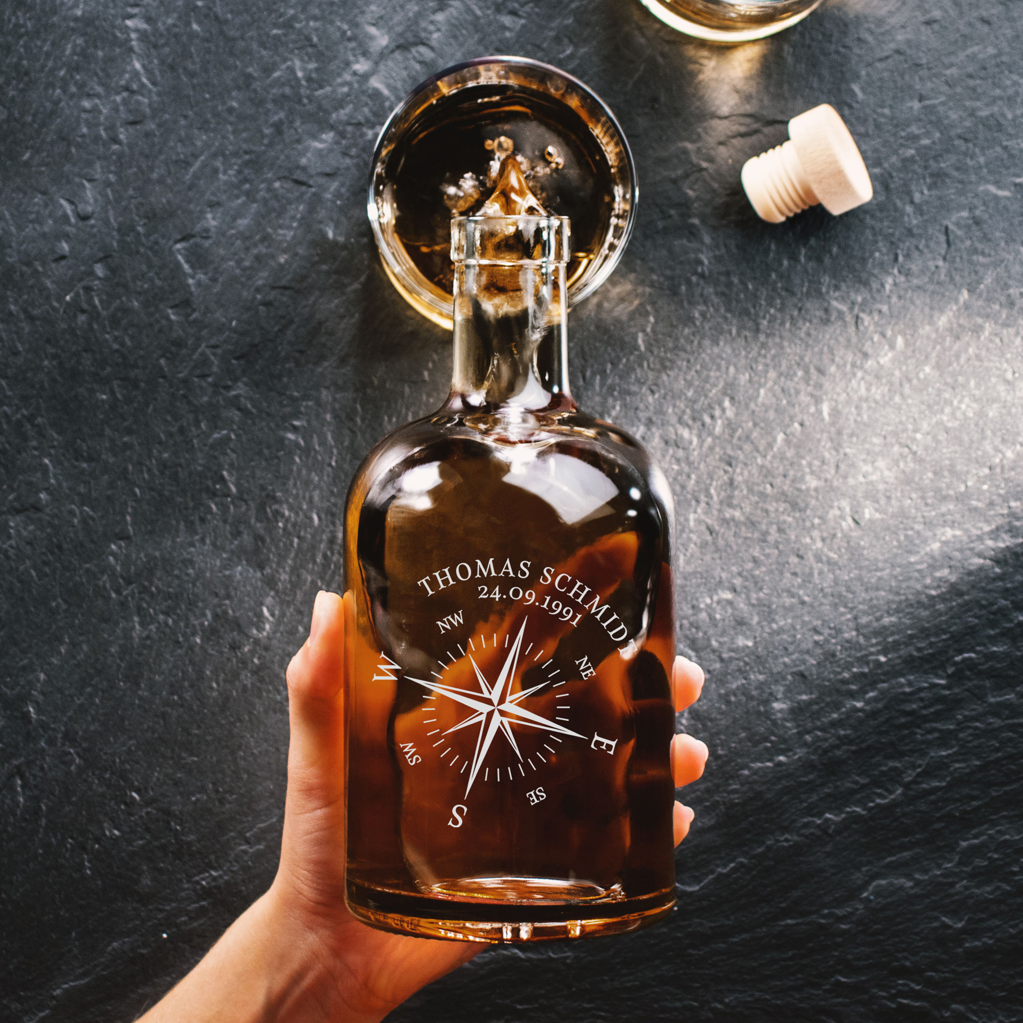 Die edle Glasflasche ist nicht nur ein praktisches und gut aussehendes Behältnis, sondern wird durch die von unseren Experten vorgenommene Gravur auch zu einem ganz persönlichen Geschenk. Graviert werden ein filigranes Windrosen-Symbol, ein Wunschname und ein Wunschdatum. So wird die Glaskaraffe mit Deckel zum idealen Geschenk für Gourmets und Menschen, die gerne genießen. Die hochwertige Flasche aus Echtglas ist ideal für alle möglichen Arten von Getränken - perfekt zum Beispiel für Whiskey, Gin, andere Spirituosen, Säfte, Sirup oder auch als Wasserkaraffe.
