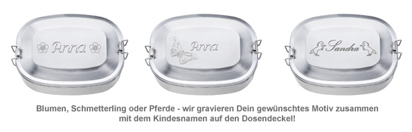 Die Gravierte Lunchbox für Mädchen - quadratisch bekommst Du mit einem von drei Wunschmotiven - entweder Blumen, Pferde oder ein Schmetterling. Bei so liebevoll verspielten Motiven bleiben wirklich keine Mädchenwünsche offen. Zu einem originellen Unikat wird die Brotbox allerdings erst durch Deine individuelle Wunschgravur. Ob der vollständige Vor- oder ein Spitzname - lasse die Brotbüchse für Deine Kleine mit ihrem Rufnamen versehen! Und trotz all der besonderheiten, bleibt die hochwertige Box geschmacksneutral und leicht zu säubern und verfügt sogar über einen herausnehmbaren Trenner. Einfach ein tolles Geschenk für Kids, die stolz ihr Pausenbrot selbständig mit sich tragen. Ob zum Schulanfang, Kindergarten, Geburtstag oder zwischendurch, weil die alte Brotdose den Geist aufgegeben hat - die Lunchbox wird Kinderaugen leuchten lassen und die großen Pausen ordentlich aufwerten. Viel Spaß beim Verschenken!