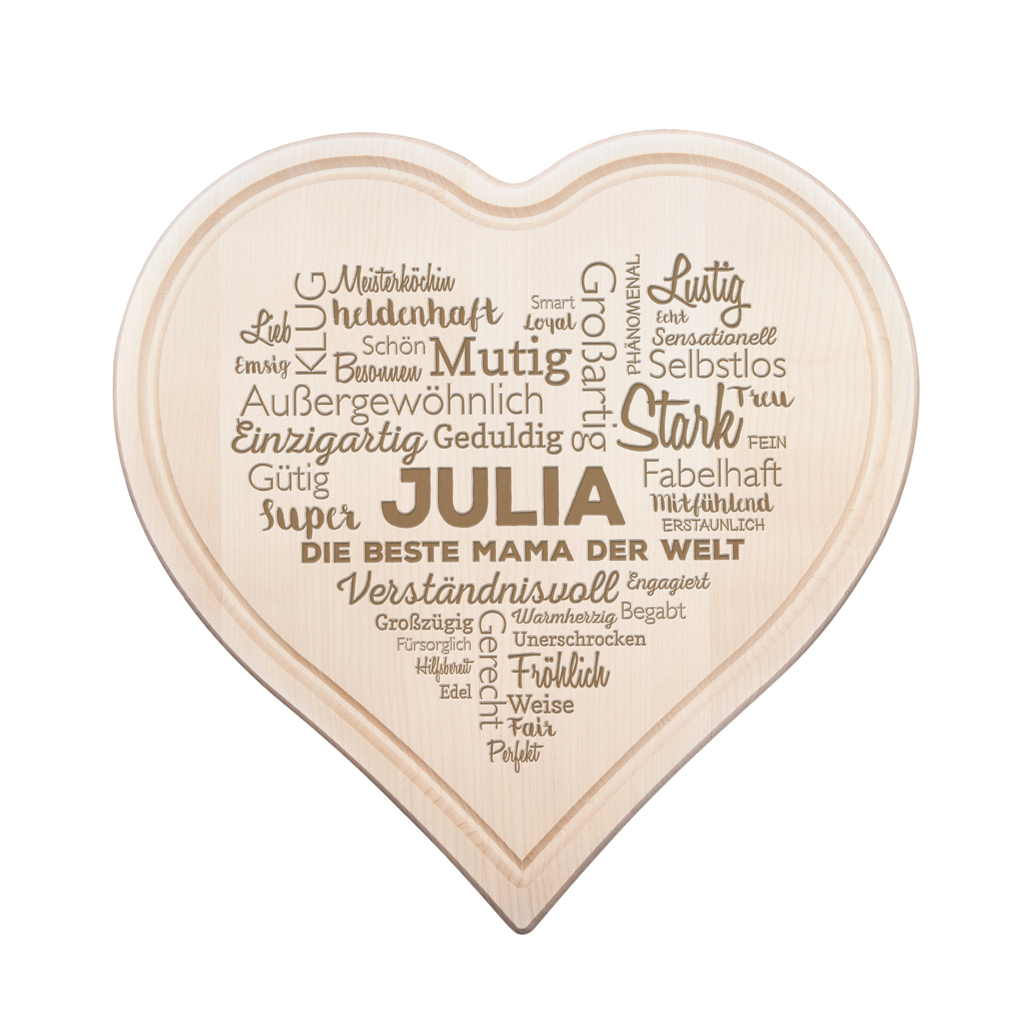 Als absolutes Highlight wird in der Mitte der Wortherz Gravur der Name Deiner Mama mit dem Schriftzug "Die beste Mama der Welt" graviert. Somit entsteht ein personalisiertes Kochbrett, das neben seiner genialen Funktionalität auch optisch zu überzeugen weiß. Die integrierte Saftrille sorgt für ein sauberes Schnitterlebnis und vollendet das Holzherz zu einem wahren Allrounder für die Küche.