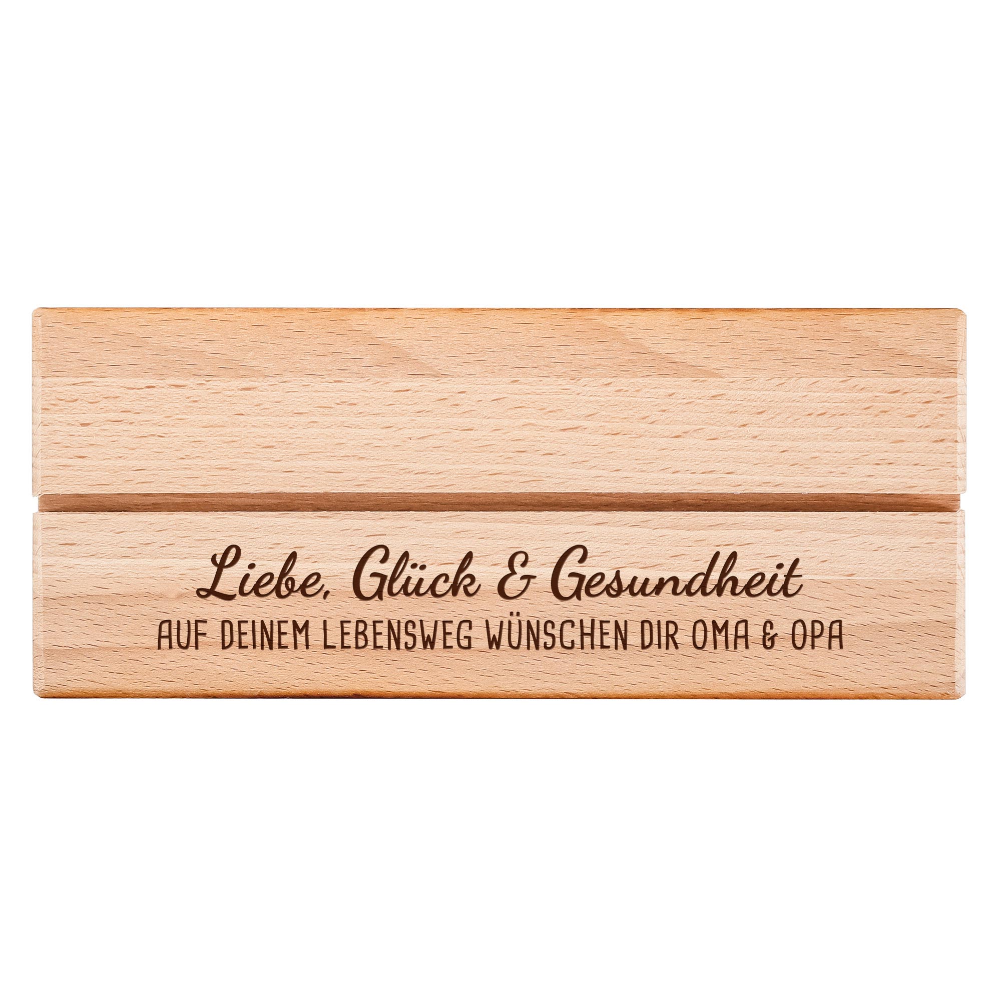 - Mit "Liebe, Glück & Gesundheit – Auf Deinem Lebensweg" und Wunschname graviert