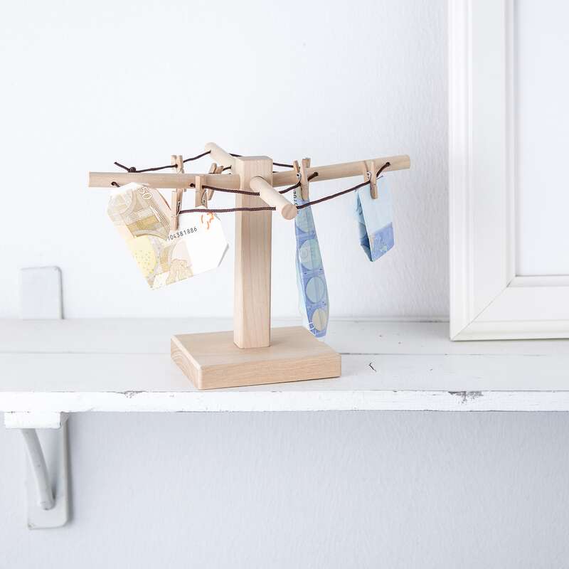 - TOP 3: Okay, hier kann gefaltet werden - muss aber nicht: An die Geld Wäschespinne können neben Scheinen auch Fotos und kleine Botschaften gehängt werden. Außerdem ist eine persönliche Gravur möglich. Schöne Geldgeschenke Hochzeit, die auch später, etwa als Memo-Board oder mit Hochzeitsbildern bestückt, Verwendung finden wird.