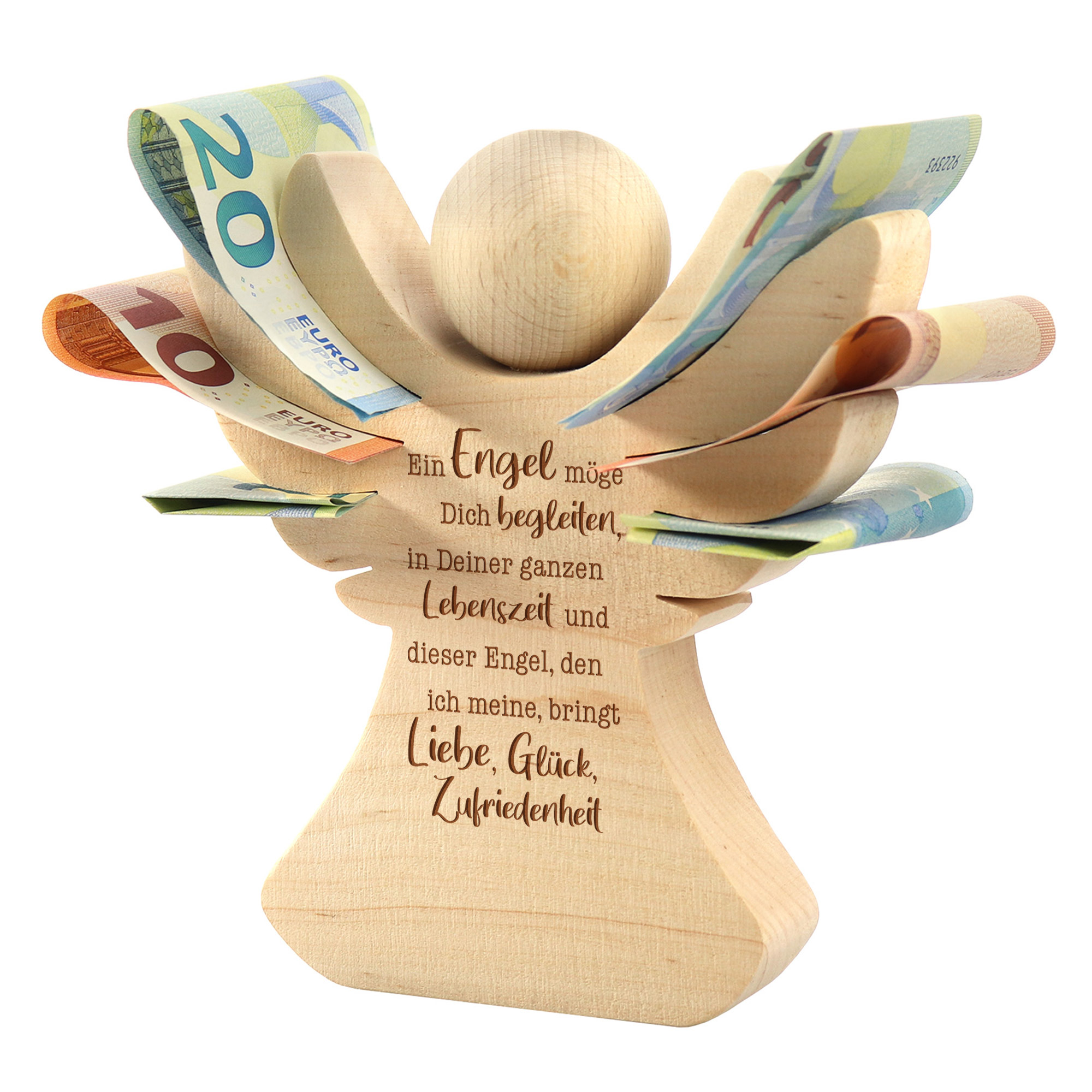 Die Taufe als religiöses Ritual entspricht der Geburt des Täuflings im christlichen Glauben: Er betritt somit die christliche Gemeinschaft, was natürlich ein Grund zum Feiern ist. Die Engelsfigur aus Holz wird mit dem Taufspruch "Ein Engel möge Dich begleiten in Deiner ganzen Lebenszeit und dieser Engel, den ich meine, bringt Liebe, Glück und Zufriedenheit" graviert. Somit ist es das perfekte Geschenk zur Taufe für (Patent-)Kinder, Enkel, Freunde, Nichten & Neffen und alle Täuflinge, denen dieser besondere Tag versüßt werden soll.