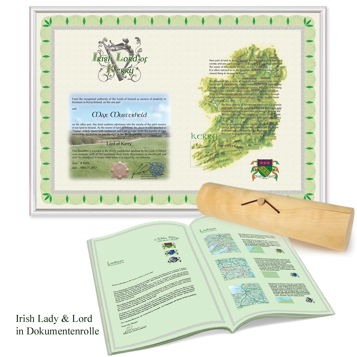 Aufsteigen in den ausgewählten Kreis irischen Adels? Aber postwendend, edler Lord und Mylady! Mit dem Irischen Lordtitel werdet Ihr herrschaftliche Mitbesitzer der Ländereien der Grafschaft Kerry, einem Landstrich ganz im Südwesten der Republik Irland, der für seine malerische Natur und nicht zuletzt auch für seine Butter berühmt ist. Du und Dein Partner seid die Auserwählten: Ihr werdet Lord of Kerry und Lady of Kerry!