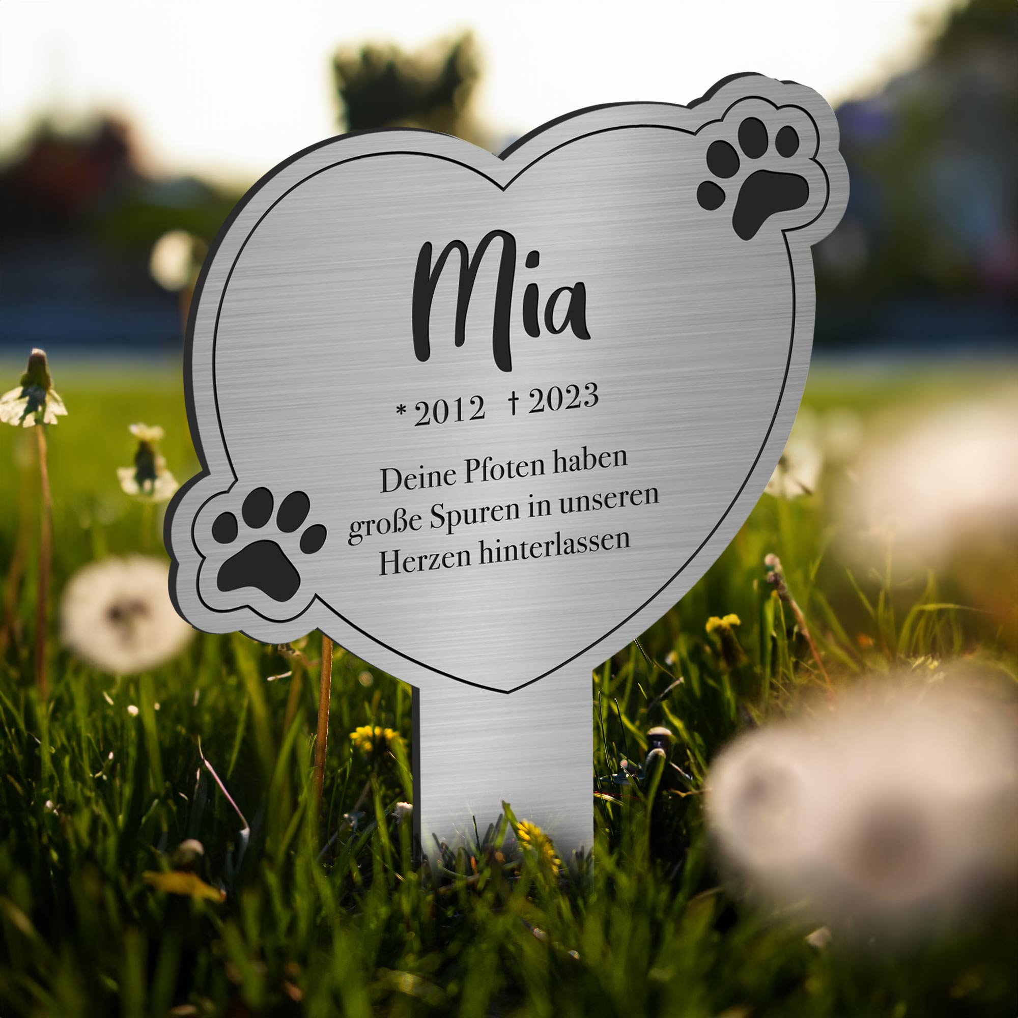 Die individuelle Grabdekoration wird sorgfältig gestaltet, um die tiefe Verbundenheit zu Deinem Haustier widerzuspiegeln. Jedes Detail, von den zarten Pfotenabdrücken bis zum fein ausgearbeiteten Schriftzug "Deine Pfoten haben große Spuren in unseren Herzen hinterlassen", wurde mit größter Sorgfalt geschaffen, um einen würdigen Ausdruck der Liebe und Hingabe zu gestalten. Schaffe mit dem besonderen Grabmarker ein wunderschönes Andenken an Deinen loyalen Vierbeiner.