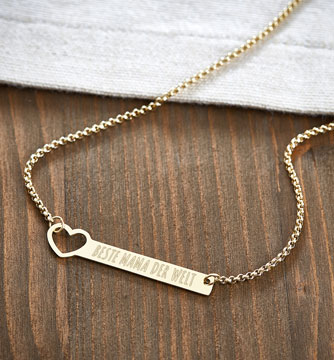 Diese Kette vereint alles, was sich eine Frau von Schmuck versprechen kann: Die goldene Farbe schmeichelt ihrem Hautton, das Design ist schlicht und dennoch auffällig. Durch die Schnörkellosigkeit fügt sich das Schmuckstück problemlos in jeden Stil ein: Ob Alltagsklamotten oder Abendkleid - diese Kette kann Deine Mutter zu jedem Anlass tragen. Das Highlight dabei ist jedoch zweifellos die Gravur, die keinen Zweifel daran lässt, für wen die Goldkette bestimmt ist, nämlich für die beste Mama der Welt!