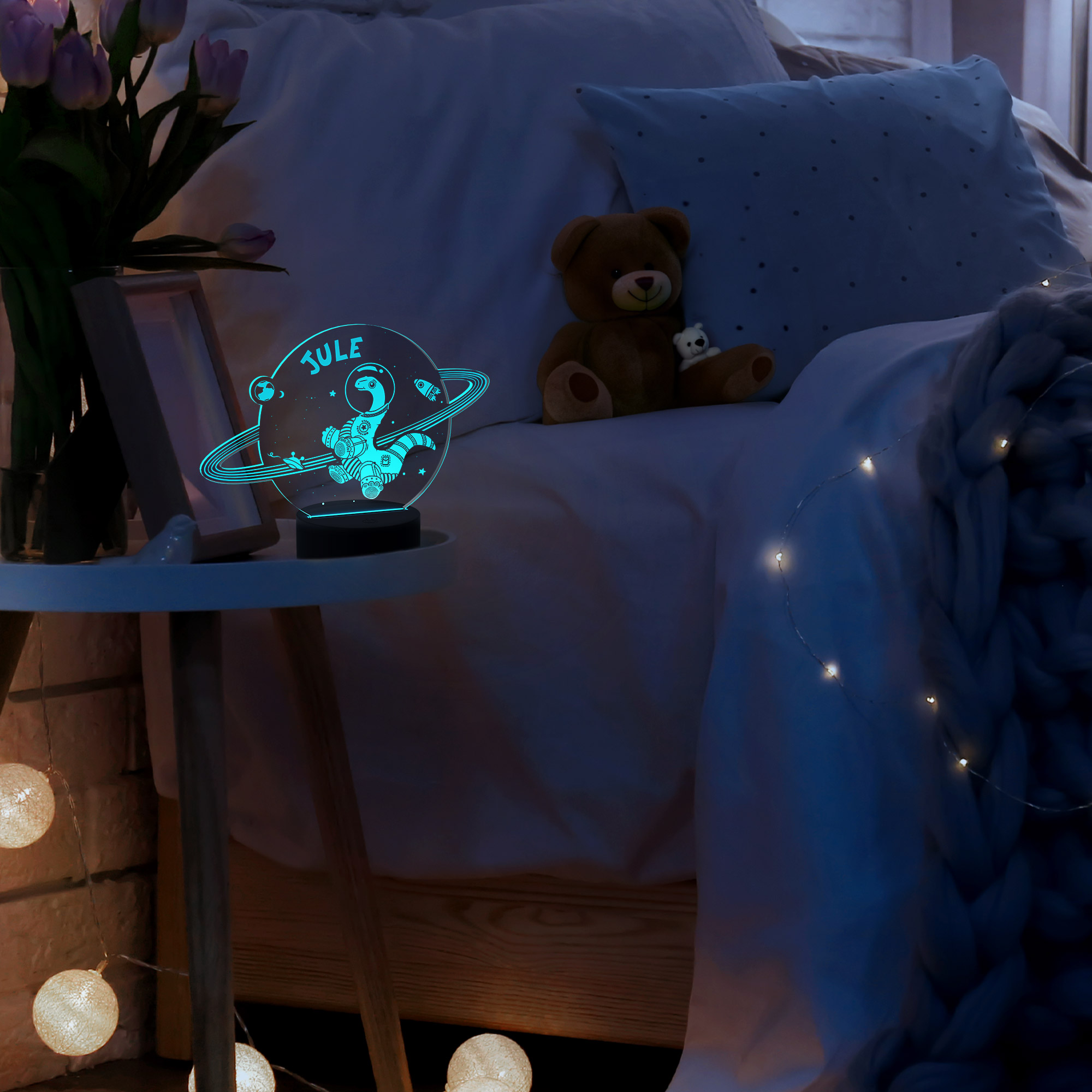 Mit der außergewöhnlichen Dinosaurier Lampe machst Du jeden Dino-Fan glücklich! Das lustige Motiv mit einem niedlichen Dino, der im Raumanzug durch das Weltall schwebt, wird nur von dem individuellen Namen übertroffen, der auf der Tischlampe verewigt wird. Die personalisierte Gravur lässt ein besonderes Nachtlicht für Kinder entstehen, das mit verschiedenen Farbeinstellungen zu überzeugen weiß.
