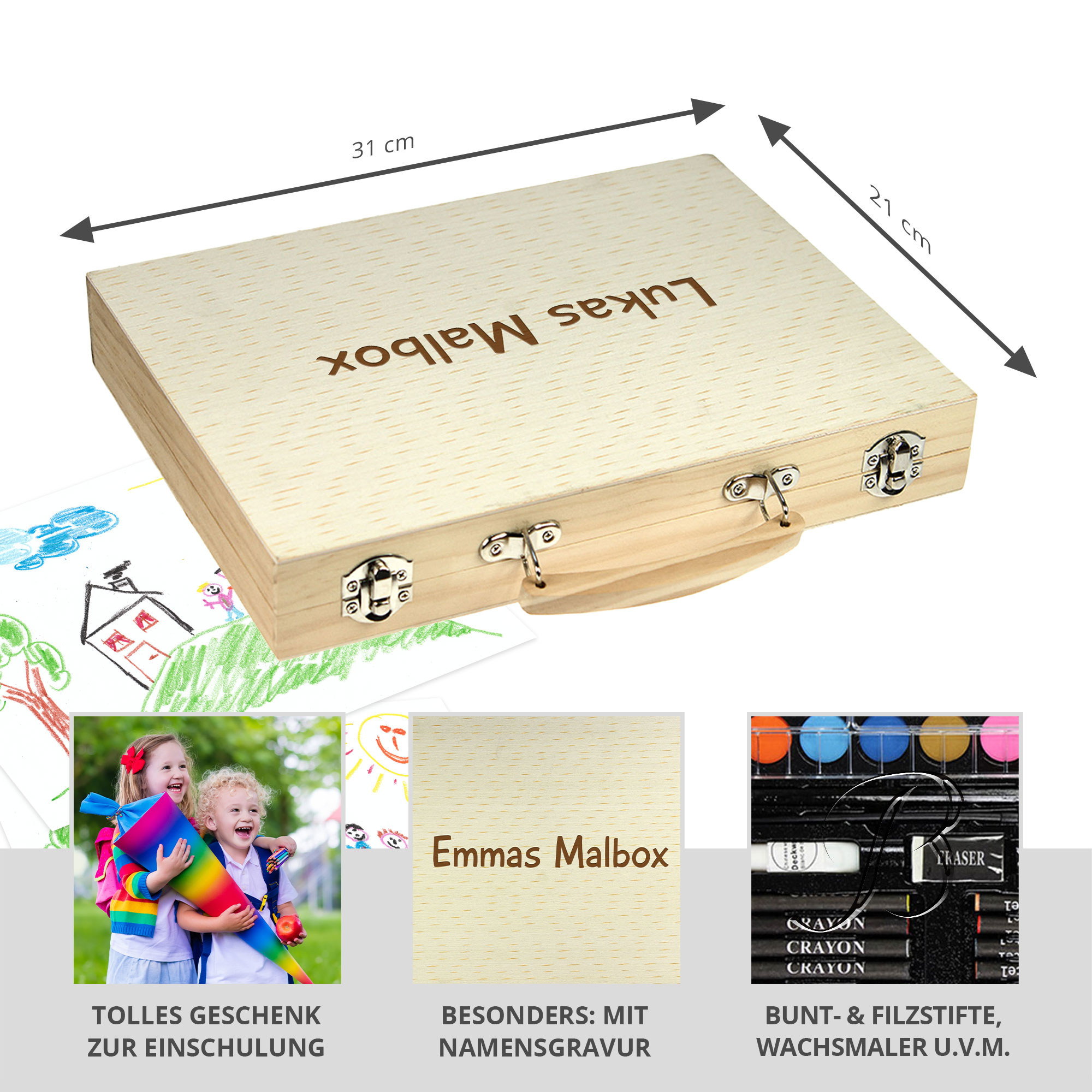 - Optional mit Standardgravur (Name + Malbox) oder mit eigener Gravur auf dem Holzkoffer - bitte oben Wunschgravur angeben!