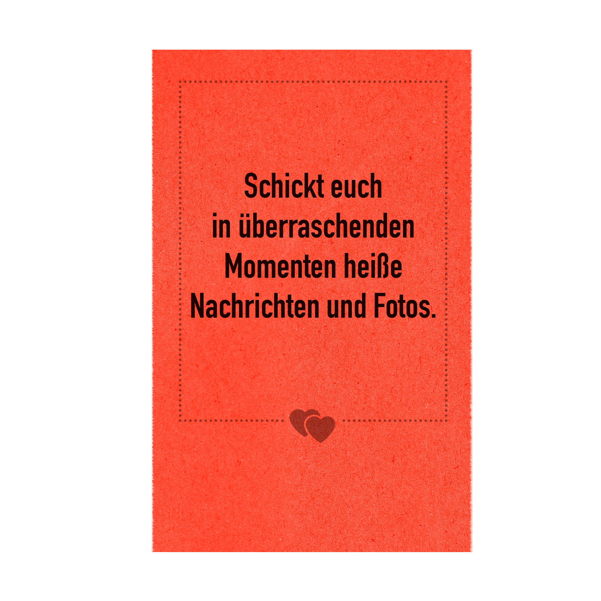 In schicker durchsichtiger Geschenkverpackung geliefert, machen die feurig roten Liebeslose bereits beim Anblick richtig neugierig: Was stecken da wohl für lustvolle Aufgaben drin? Lasst euch beide von diesem sinnlich erotischem Geschenk für Paare überraschen - über 50 Erotik Lose warten nur noch darauf, euch eine unvergesslich heiße Nacht zu bescheren! Wie wäre es beispielsweise mit verruchten Bildern, die ihr euch tagsüber schickt, vielleicht sogar in Begleitung einer Audionachricht mit expliziten Handlungsanweisungen für den Partner? Dieses Spiel für Erwachsene kennt keine Tabus und steigert nicht nur die Vorfreude...