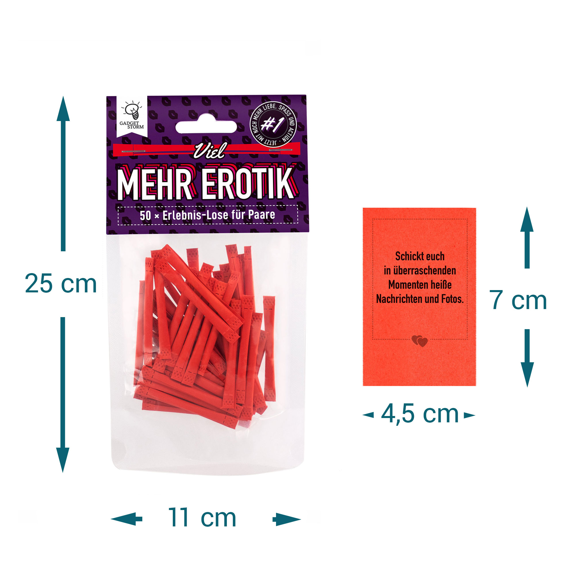 Wenn es in Deiner Beziehung lange nicht mehr geknistert hat und das Einzige, was bei euch beiden prickelt, der Sekt in den Kelchen ist, dann wird es höchste Zeit für aufregende neue Spiele für euch Zwei! Wenn Du also endlich Leben in die Kiste bringen willst, aber Deine Fantasie eben keine leidenschaftlichen Ideen liefert, dann greif gerne zu unserem neuesten provokanten Spiel für Erwachsene: Mehr Erotik - 50 Lose für Paare!