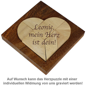 Das Mini Holz Puzzle - Herz wurde aus einem hochwertigen Holz gefertigt und da es ein Naturprodukt ist, sieht jedes Puzzle durch die unterschiedliche Holzmaserung auch anders aus. Das Mini Puzzle ist ein sogenanntes Tangram in Form eines Herzens. Tangram ist ein altes, chinesisches Legespiel, dessen Ziel es ist, die neun einzelnen Puzzleteile zu so vielen Figuren wie möglich zu formen. In unserem Fall gibt es ganze 49 mögliche Figurenvariationen, sodass man sich einige Zeit lang mit dem Tangram beschäftigen wird. Und wenn es am Anfang nicht so gut klappt, dann kannst Du ja einen kurzen Blick auf das mitgelieferte Lösungsblatt werfen. Das Mini Holzpuzzle ist eine schöne Geschenkidee für alle Puzzle- und Knobelfans, die durch den Kontrast von hellem Holzpuzzle und dunklem Holzrahmen zu einem echten Hingucker wird! Auf Wunsch, kannst Du das Puzzle zusätzlich mit einer schönen Gravur versehen lassen - so wird daraus ein echtes Einzelstück mit einer persönlichen Note!