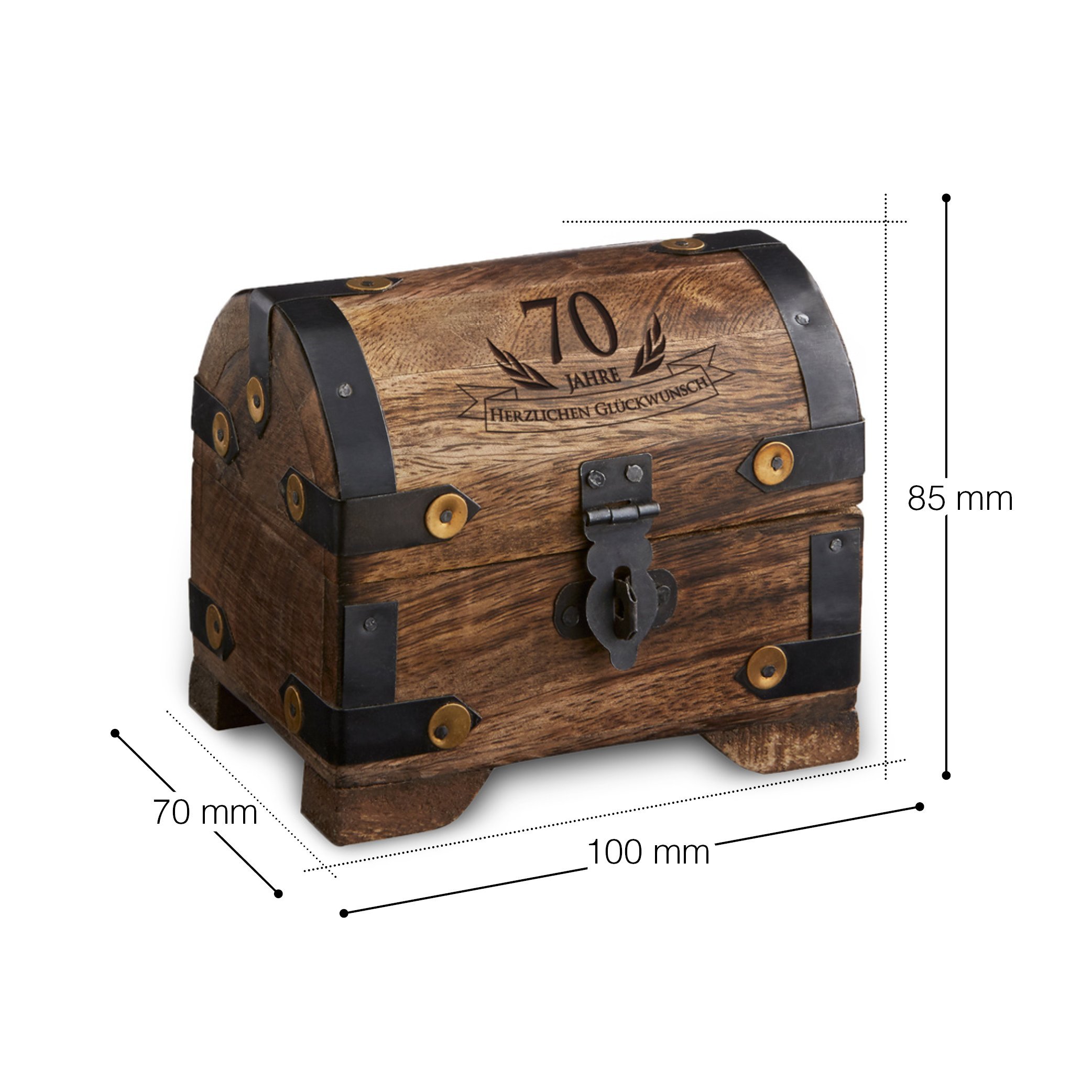 Die kleine Schatzkiste wird noch so manchen Deiner Freibeuter Gäste den Kopf verdrehen, wenn sie die Schmuckschatulle als elegante Dekoration auf Deinem Schreibtisch entdecken. Die wertige Gravur "70 Jahre" mit dem Schriftzug Banner "Herzlichen Glückwunsch" wird bei genauerer Betrachtung der Holztruhe die besonderen Erinnerungen an einen ganz speziellen Tag im Leben des glücklich Beschenkten aufleben lassen. Verschenke ein außergewöhnliches Erinnerungsstück mit einer Portion Abenteuerlust und genieße die Wirkung Deines Überraschungsschatzes auf der Feier.