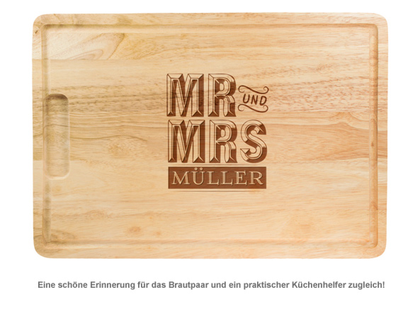 Zur Hochzeit möchte man nur ungern ein 08/15 Geschenk überreichen, denn schließlich ist dieser Tag etwas ganz besonderes für das Paar. Da sollte natürlich auch das passende Geschenk her. Doch was macht man, wenn man das Brautpaar nicht so gut kennt oder nicht weiß, was im Haushalt noch benötigt wird? Ein kleiner Tipp von uns: Mit einem persönlichen Geschenk kannst Du gar nichts falsch machen und mit unserem personalisierten Schneidebrett - Mr und Mrs überreichst Du eine persönliche Geschenkidee mit praktischem Wert!
