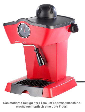 Die Premium Espressomaschine ist ein Küchengerät, das jeden Feinschmecker-Haushalt bereichert. Bester Kaffeegenuss, der wach macht und nebenbei den Geldbeutel schont. In ihrem roten Retro-Look muss sie sich auch optisch keinesfalls verstecken. Tolle Geschenkidee für zuhause!