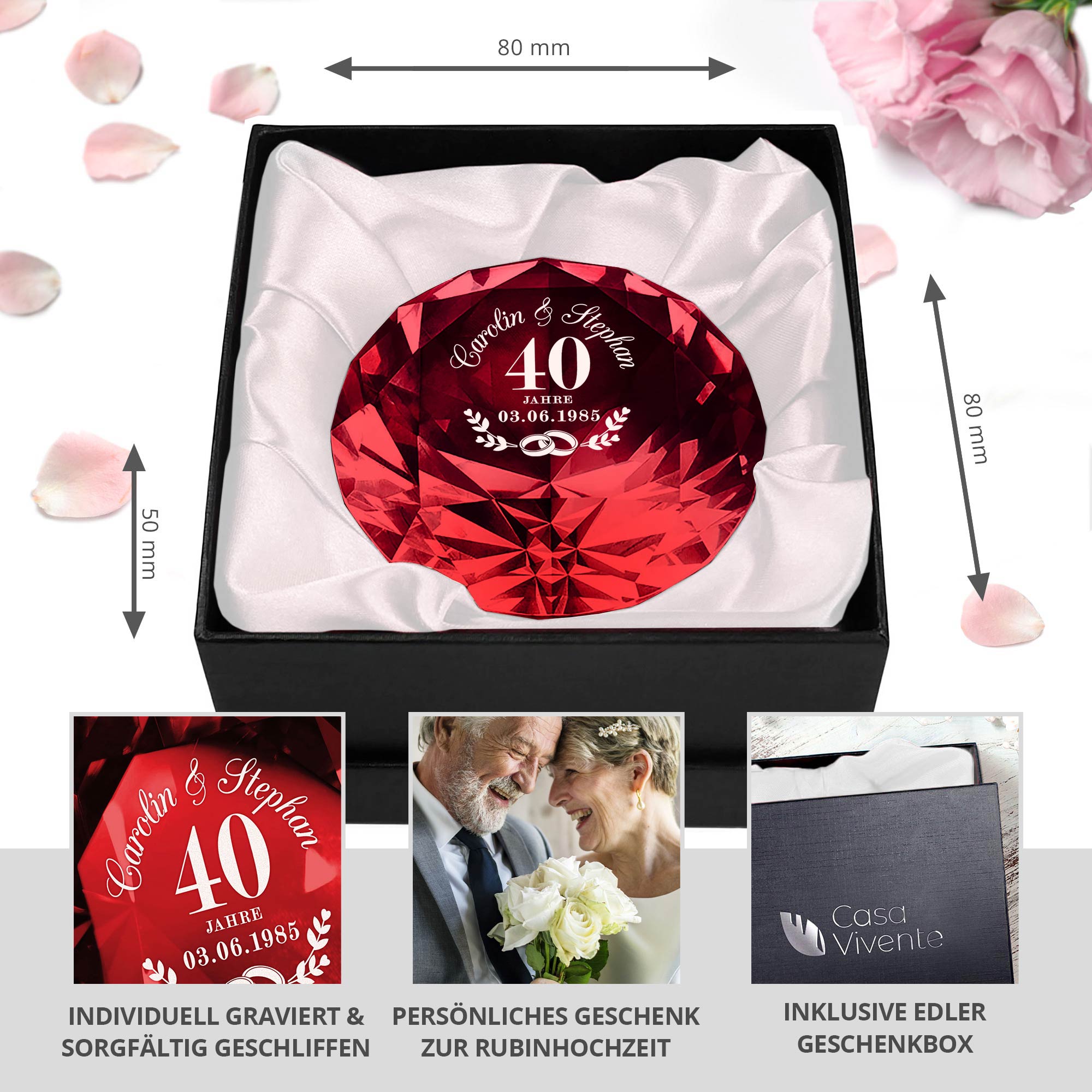 Mache den 40. Hochzeitstag Deiner Eltern, Freunde oder des eigenen Partners zu einem unvergesslichen Ereignis. Dieses Geschenk vereint Eleganz, Liebe und eine persönliche Note und bleibt als funkelnde Erinnerung an die Rubinhochzeit für immer erhalten. Eine Geste, die zeigt: "Eure Liebe ist etwas ganz Besonderes!"