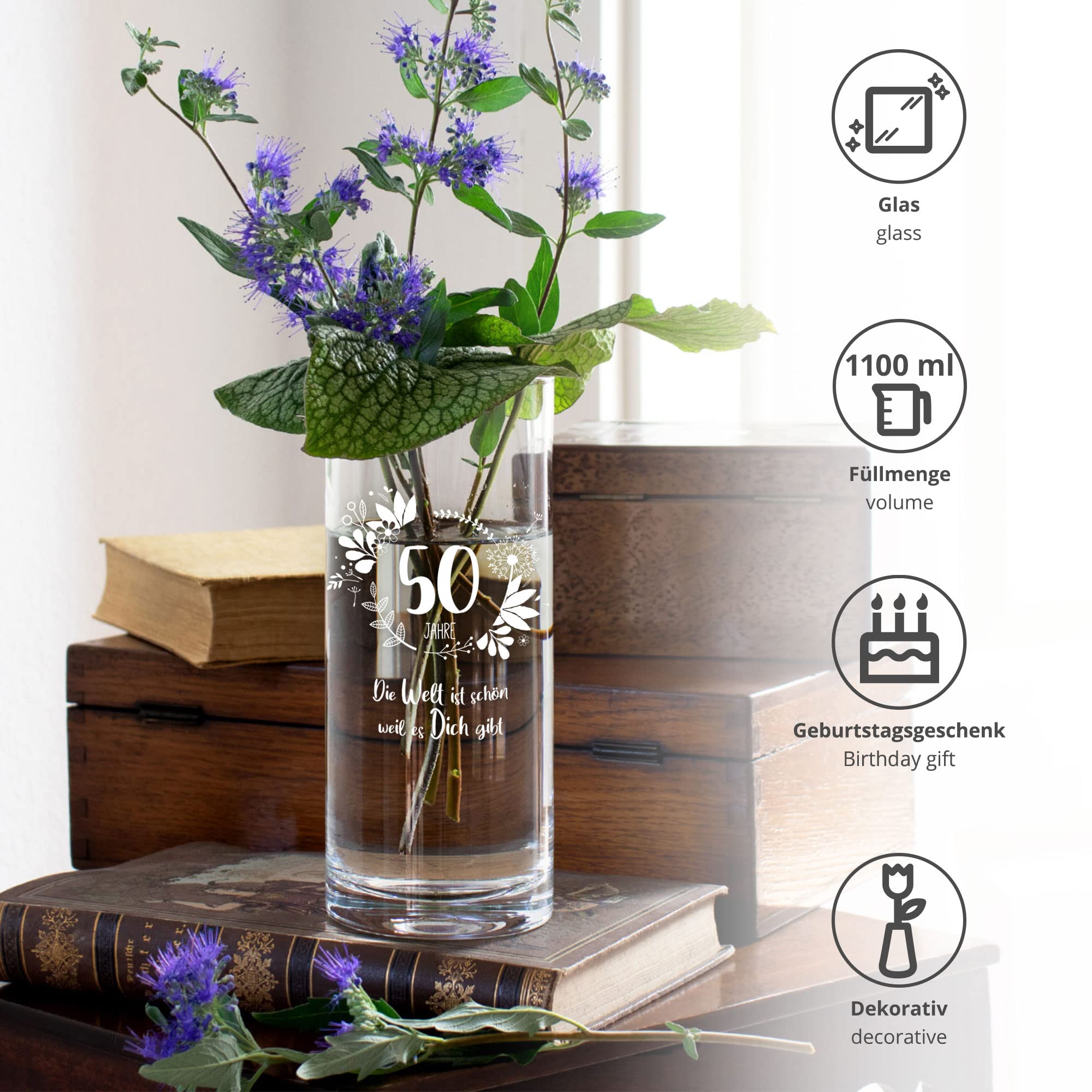 Ein halbes Jahrhundert des Lebens ist ein bemerkenswerter Meilenstein, der gebührend gefeiert werden sollte. Diese wunderschöne runde Blumenvase aus transparentem Glas ist ein Geschenk, das nicht nur die Schönheit des Moments einfängt, sondern auch die kostbaren Erinnerungen der Vergangenheit ehrt. Die zarte Gravur "Die Welt ist schön, weil es Dich gibt" verleiht dieser Vase eine zeitlose Bedeutung und macht sie zu einem berührenden Symbol der Dankbarkeit für das Leben und die Menschen, die es mit uns teilen.