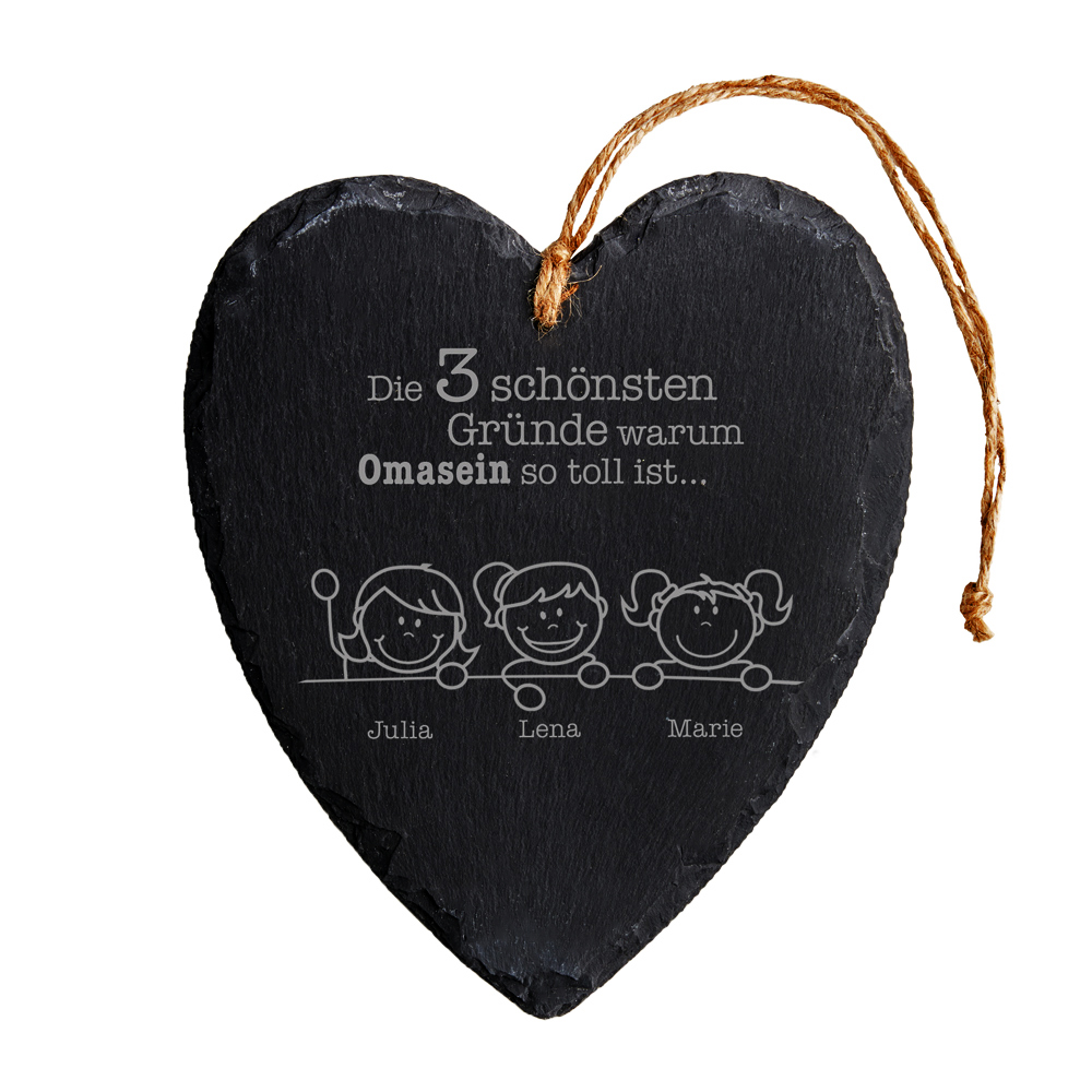 Das Schieferherz - "Warum Omasein so toll ist" ist ein Herz aus hochwertigem Schiefer, das seinen ganz besonderen Charme durch Deine individuelle Namensgravur erhält. Je nachdem, wie viele Enkelkinder Deine Großmutter hat, steht auf dem Schieferherz zum Beispiel "Die 3 schönsten Gründe, warum Omasein so toll ist". Über Deiner Wunschgravur sind zusätzlich niedliche Kinderköpfe - als Mädchen, Jungen oder beides- abgebildet, so dass Du Deiner Oma ein einzigartiges Geschenk mit liebevoller Botschaft und Unikatscharakter überreichen kannst.