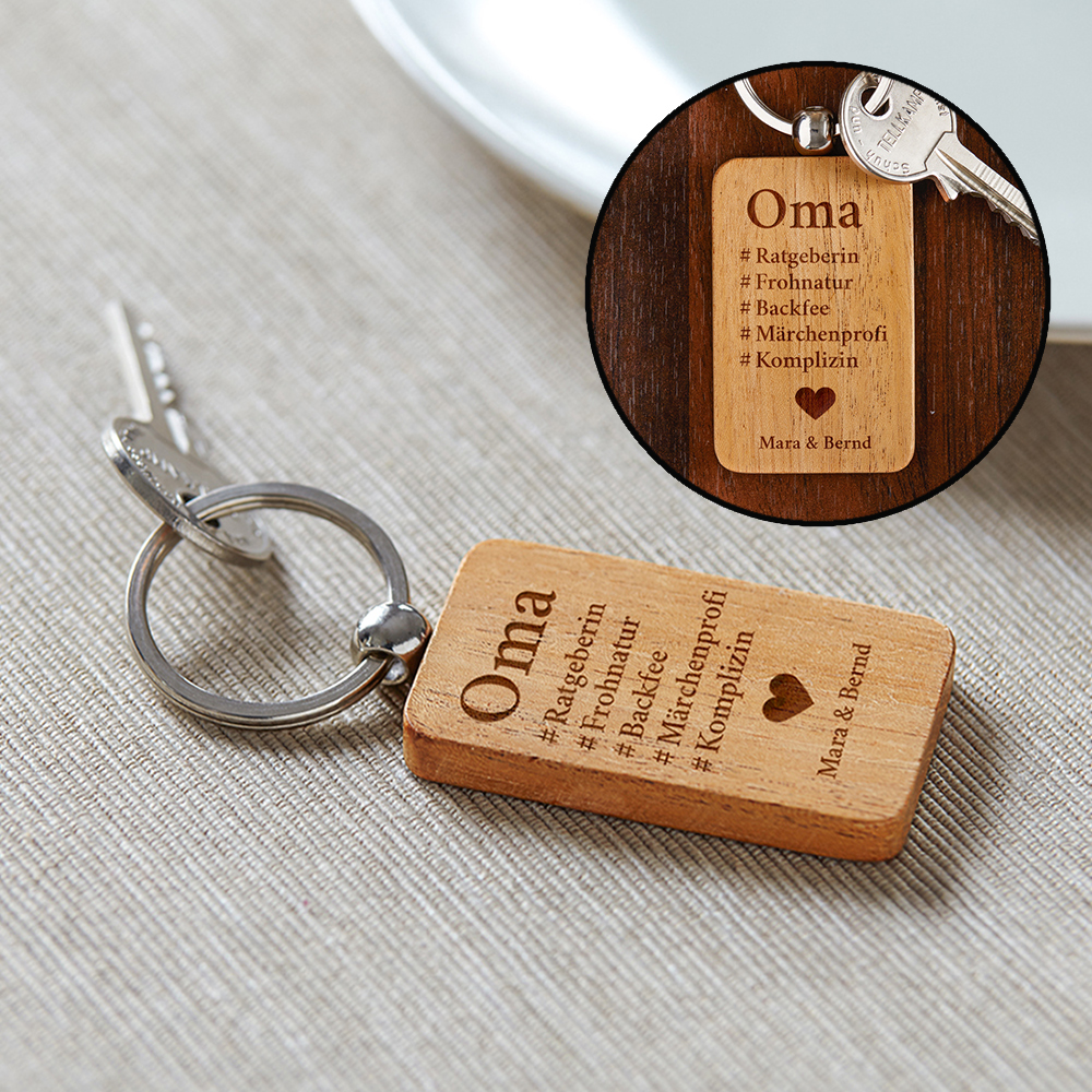 Deine Oma hat Geburtstag, Weihnachten steht vor der Tür oder Du möchtest Deiner Großmutter einfach zwischendurch eine kleine Freude bereiten? Wir haben hier genau das passende Geschenk für Dich! Der kleine Schlüsselanhänger aus hochwertigem Holz listet all die Dinge auf, die die Rolle einer Oma für ihre Enkelkinder so besonders machen. Sie ist eine gutgelaunte Ratgeberin, kann wunderbar kochen und Geschichten erzählen und steht Dir in schwierigen Zeiten zur Seite. Passt diese Beschreibung zu Deiner Oma? Dann ist unser Holzanhänger eine liebevolle Art, dafür Danke zu sagen, dass sie immer für Dich da ist. Wirklich einzigartig wird der Anhänger natürlich durch die professionelle Gravur Deines Namens oder auch der Namen mehrerer Enkelkinder. So kann Deine/Eure Großmutter immer eine Erinnerung an ihre lieben Kleinen mit sich tragen. Durch die Verwendung der modernen Hashtag-Zeichen ist der Anhänger allerdings mehr als ein bloßes Erinnerungsstück. So wird er zu einer Kombination aus zeitlosem Holzschmuck und angesagtem Accessoire, das Deiner Oma ganz bestimmt gefallen wird.