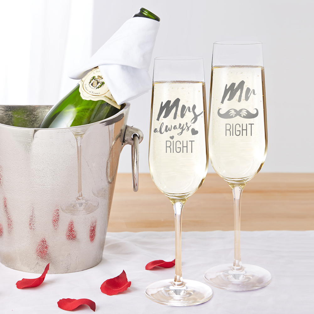 Die modernen Sektgläser mit extra großem Fassungsvermögen werden professionell von uns graviert. Das Glas des Bräutigams wird mit dem Schriftzug "Mr Right" und einem Moustache-Motiv versehen, während das Sektglas für die Braut passend dazu als Gag mit der Schrift "Mrs Always Right" und kleinen Herzsymbolen aufgewertet wird. Denn so ist es nun einmal: Sie hat ihren Mr. Right gefunden und er muss fortan damit leben, dass sie immer Recht hat... So erhalten Ehefrau und Ehemann jeweils ein eigenes Glas, das sie nicht nur am Tag der Hochzeit, sondern auch darüber hinaus als witziges und bleibendes Andenken begleiten wird. Es ist beispielsweise eine schöne Idee, an jedem Hochzeitstag mit diesen Gläsern auf die gemeinsamen Jahre anzustoßen. Doch auch als Geschenk zur silbernen, goldenen oder auch diamantenen Hochzeit sind diese Gläser eine geniale Geschenkidee. Ganz egal, ob Du das Set einem befreundeten Paar zur Hochzeit, Deinen Eltern zur Silberhochzeit oder Deiner Frau als kleines lustiges Geschenk zum Hochzeitstag überreichen möchtest, wir wünschen auf jeden Fall viel Spaß beim Verschenken und sagen: "Prost!".