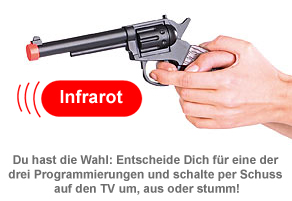 Ein mitgelieferter Sheriff-Stern rundet den Alltags-Spaß perfekt ab. Sag nervigen Werbespots und schlechten Sendungen "hasta la vista, Baby!" und mit einem Schuss wirst Du zum Revolverhelden der Fernsehlandschaft. Dabei hast Du die Wahl, welchen Befehl Dein Schuss ausführt. Je nach Programmierung lässt sich entweder das Programm wechseln oder der Fernseher aus- oder stumm schalten.