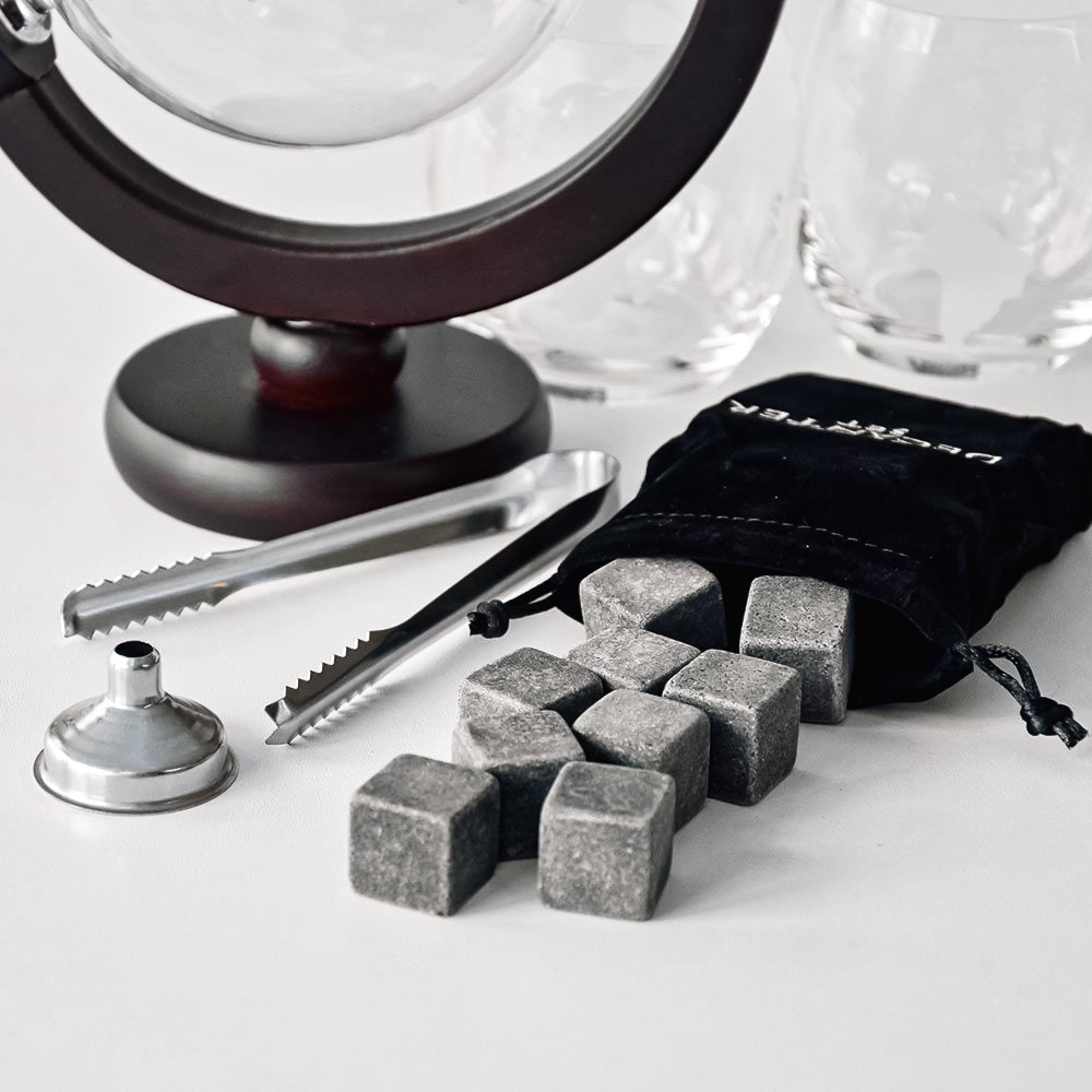- Set beinhaltet Globus Karaffe, Holzständer, 2 Whiskygläser, 9 Whiskysteine mit Tasche, Trichter und Eiszange